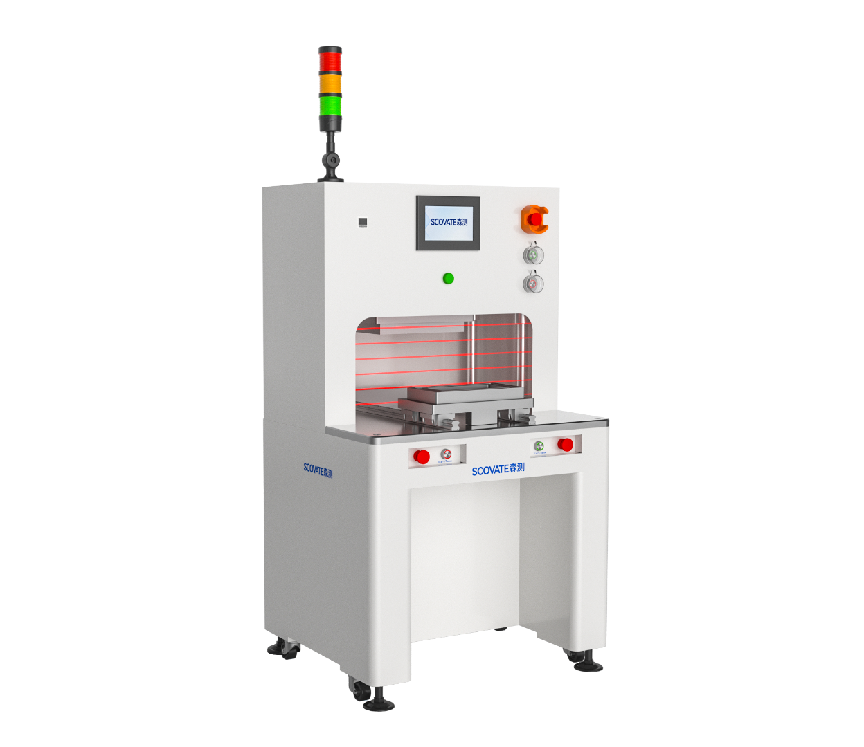 动作流程:人工将待测产品放入治具,按下启动键后机台自动完成以下动作:治具自动送入测试工位→气密检测→OK品绿灯亮,NG品红灯亮。